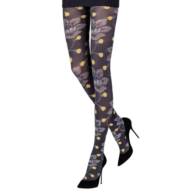 Collant fantaisie à fleurs de Lotus est une création de collant fantaisie et tendance noir gris moutarde, ce collant fait de très belle jambes