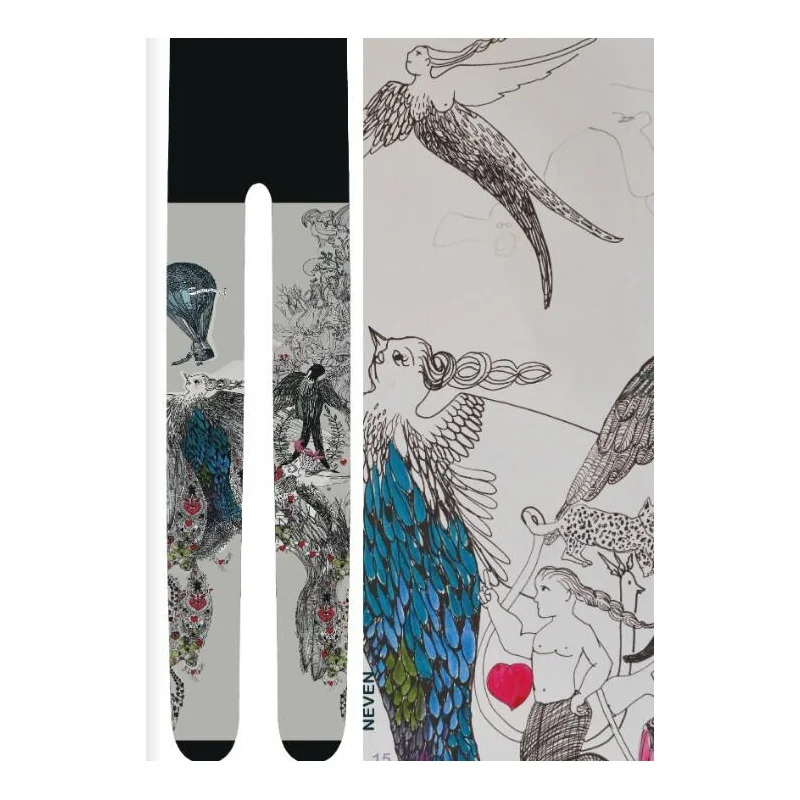Ce collant base blanche n’est pas sans rappeler les nuages dans un ciel ou des créatures mi oiseaux mi homme volent avec de magnifique ramage à plumes.