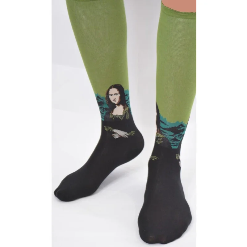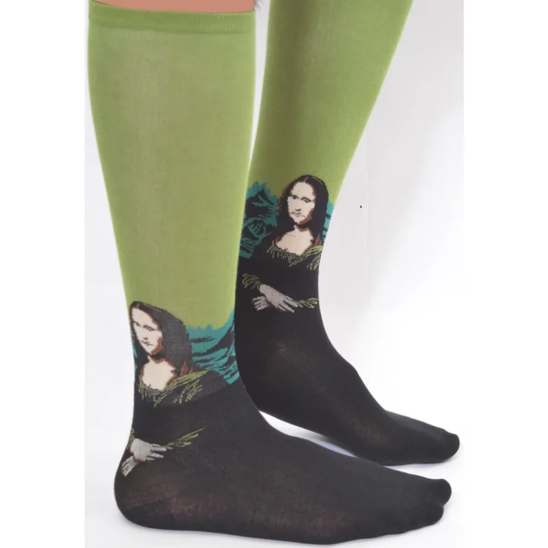 Jolie chaussettes fantaisie en coton souple hautes qui arrivent sous les genoux souples et confort pour les amateurs d’art .