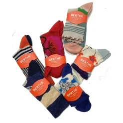 Les Mi bas Berthe aux grands Pieds sont disponible en base marine aux oiseaux Gris; base marine avec les oiseaux jaunes, et base noires avec les motifs vert d’eau
